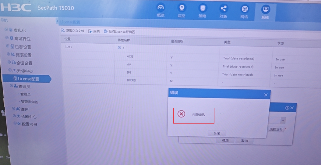 T5010安装临时授权出现“内部错误”告警,重新采集did、使用新的授权码生成文件导入,还是会出现该告警。请问可能是什么原因?