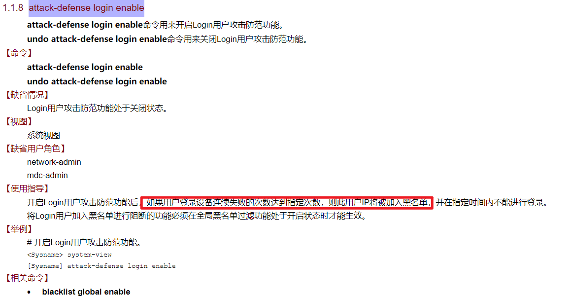 attack-defense login enable命令用来开启Login用户攻击防范功能。