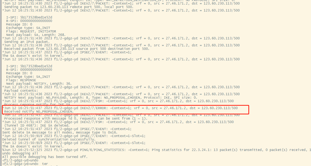 *Jun 12 15:43:09:537 2023 f1/2-gdgz-yd IPSEC/7/EVENT: -COntext=1; Got SA time-based soft lifetime settings when filling Sp data. Configured soft lifetime buffer : 0 seconds. Configured global soft lifetime buffer : 0 seconds. *Jun 12 15:43:09:547 2023 f1/2-gdgz-yd IPSEC/7/EVENT: -COntext=1; Sent delete SA message to all nodes, message type is 0x16. *Jun 12 15:43:09:053 2023 f1/2-gdgz-yd IPSEC/7/EVENT: -COntext=1-Slot=1; Deleted tunnel of synchronization successfully. *Jun 12 15:43:09:053 2023 f1/2-gdgz-yd IPSEC/7/EVENT: -COntext=1-Slot=1; The SA doesn't exist in kernel. *Jun 12 15:43:09:547 2023 f1/2-gdgz-yd IPSEC/7/EVENT: -COntext=1; The SA doesn't exist in kernel. *Jun 12 15:43:11:738 2023 f1/2-gdgz-yd IPSEC/7/EVENT: -COntext=1; Can't find block-flow node. *Jun 12 15:43:11:738 2023 f1/2-gdgz-yd IPSEC/7/PACKET: -COntext=1; Failed to find SA by SP, SP Index = 0, SP Convert-Seq = 65536. *Jun 12 15:43:11:738 2023 f1/2-gdgz-yd IPSEC/7/ERROR: -COntext=1; The reason of dropping packet is no available IPsec tunnel. *Jun 12 15:43:11:738 2023 f1/2-gdgz-yd IPSEC/7/EVENT: -COntext=1; Sent SA-Acquire message : SP ID = 0 *Jun 12 15:43:11:738 2023 f1/2-gdgz-yd IPSEC/7/EVENT: -COntext=1; Received negotiatiate SA message from IPsec kernel. %Jun 12 15:43:11:738 2023 f1/2-gdgz-yd IPSEC/6/IPSEC_SA_INITIATION: -COntext=1; Began to establish IPsec SA. SA information: Local address: 27.46.171.2 Remote address: 123.60.230.113 Sour addr: 22.3.24.2/255.255.255.255 Port: 0 Protocol: IP Dest addr: 22.3.24.1/255.255.255.255 Port: 0 Protocol: IP Inside VPN instance: Outside VPN instance: ACL name: songshanhu