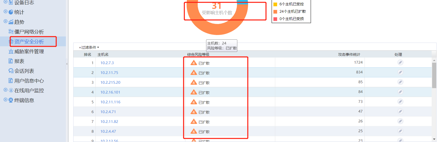 H3C SecPath T1000-AI-50入侵防御系统,资产安全分析界面显示受影响主机数量好多,已经到了已扩散的程度,先问下这个是误报还是真的病毒,如是病毒,应该怎么解决这个问题
