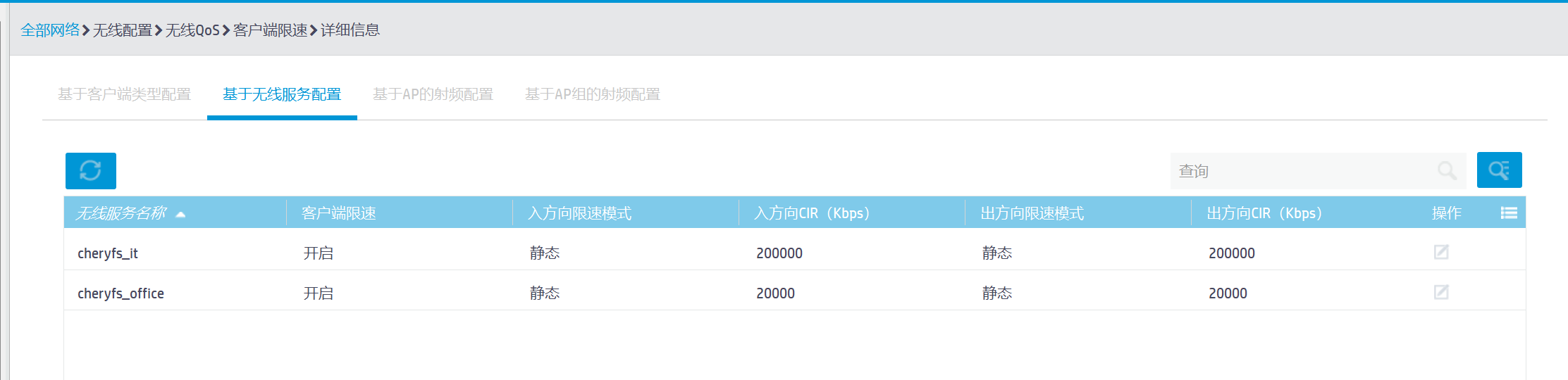 (2) 基于AP射频的限速,在AP射频下可以绑定多个服务模板,基于射频的限速将限制该射频下接入的所有无线客户端,基于射频的限速也分为动态限速和静态限速;