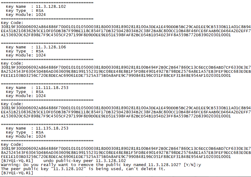 再路由器上删除11.3.128.102的公钥时提示:“The peer public key "11.3.128.102" is being used, can't delete it.”