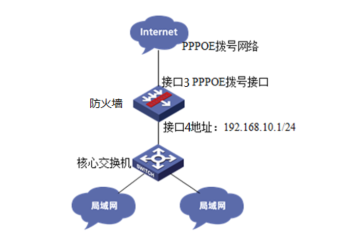 将防火墙部署在互联网出口,使用PPPOE拨号方式接入互联网。运营商提供的拨号账号为:hz123456,密码为:123456。初步规划防火墙使用3接口接入运营商,使用4接口连接内部网络,内部网络使用192.168.10.0网段,要求内网终端可以自动获取到地址并可以访问互联网。