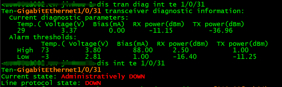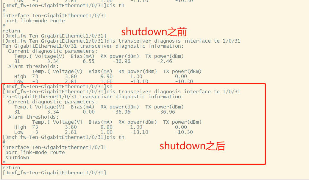 1.在原先线路正常,光模块收发光正常,端口状态的情况下,把端口手动shutdown,此时端口是否能看到收发光?