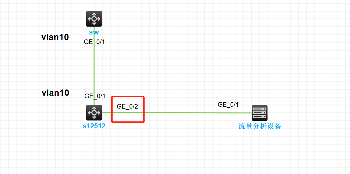 如图,做本地镜像到流量分析设备。现在12512的镜像源端口是g1/0/1,目的端口是g1/0/2.