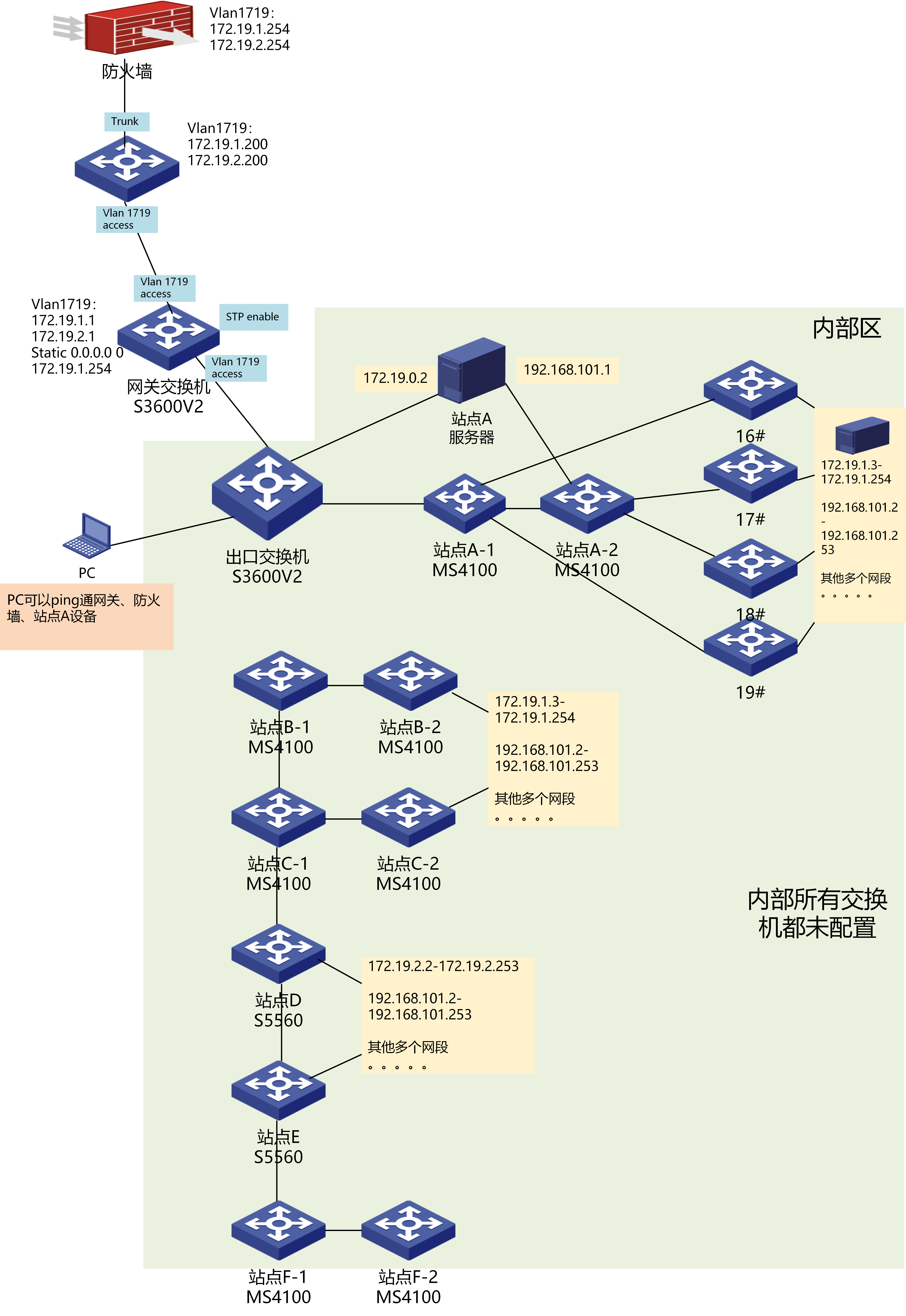 内部区域交换机都未配置 内部终端网关地址都是172.19.1.1 172.19.2.1