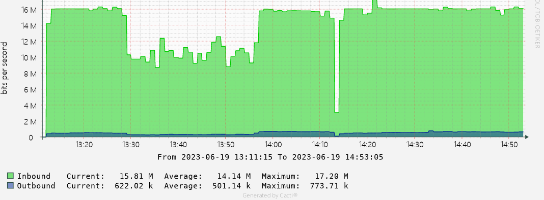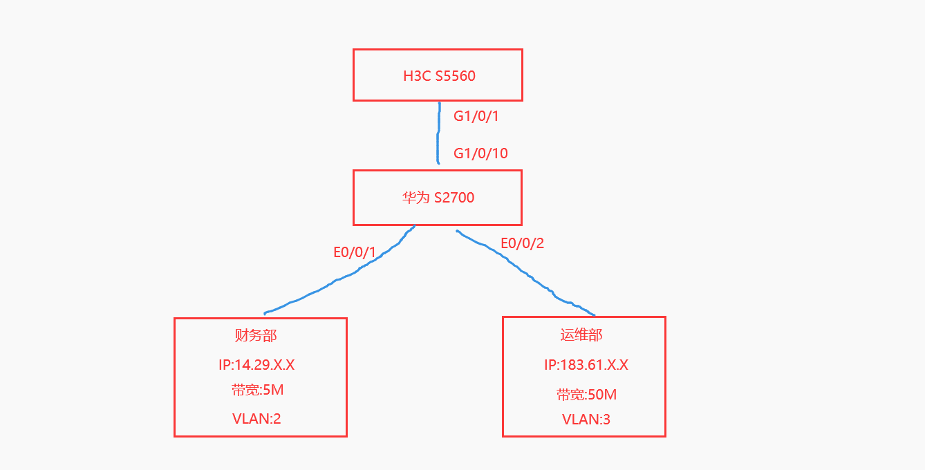 问题:公司H3C S5560三层交换机为核心,接入层为华为S2700交换机(不支持端口QOS限速),接入层交换机下有2个不同网段的IP提供出口,分别对应不同的两个部门,部门为:财务部和运维部;财务部带宽5M,运维部带宽为50M;由于接入层交换机不支持QOS限速,只能通过核心去做QOS限速,限速操作是放开接入层上联为55M,而单独对财务部门5M去做QOS限速。QOS无效果,附上财务部门的流量图如下:
