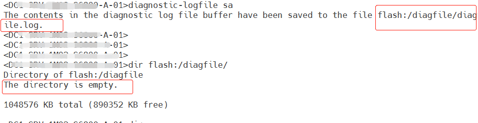 Diagnostic log file: Enabled Diagnostic log file size quota: 10 MB Diagnostic log file directory: flash:/diagfile Writing frequency: 24 hour 0 min 0 sec