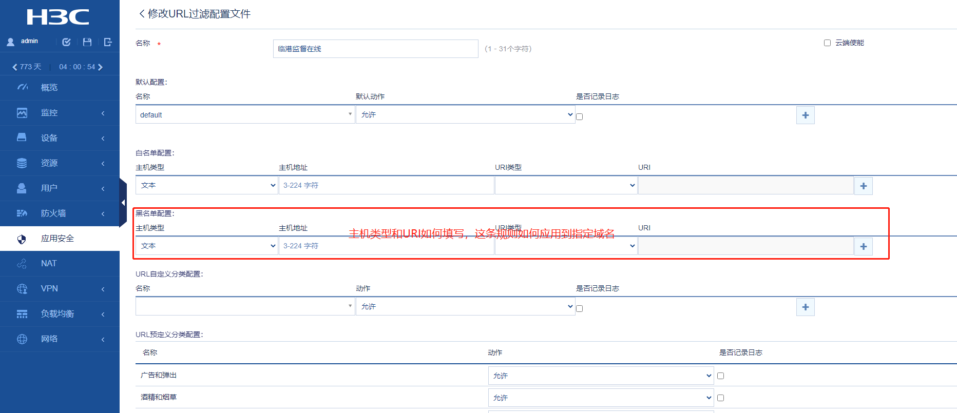 请问SecPath F5000C防火墙如何设置url过滤?黑名单中的主机类型和Uri类型如何填写,比如我希望过滤一个域名含有“~”等非法字符的请求,我应该如何设置