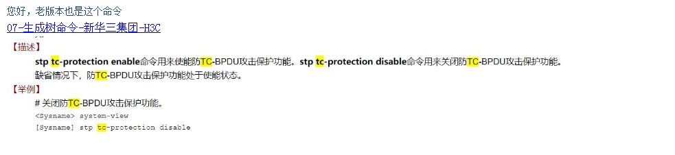 stp tc-protection enable命令用来使能防TC-BPDU攻击保护功能。stp tc-protection disable命令用来关闭防TC-BPDU攻击保护功能。