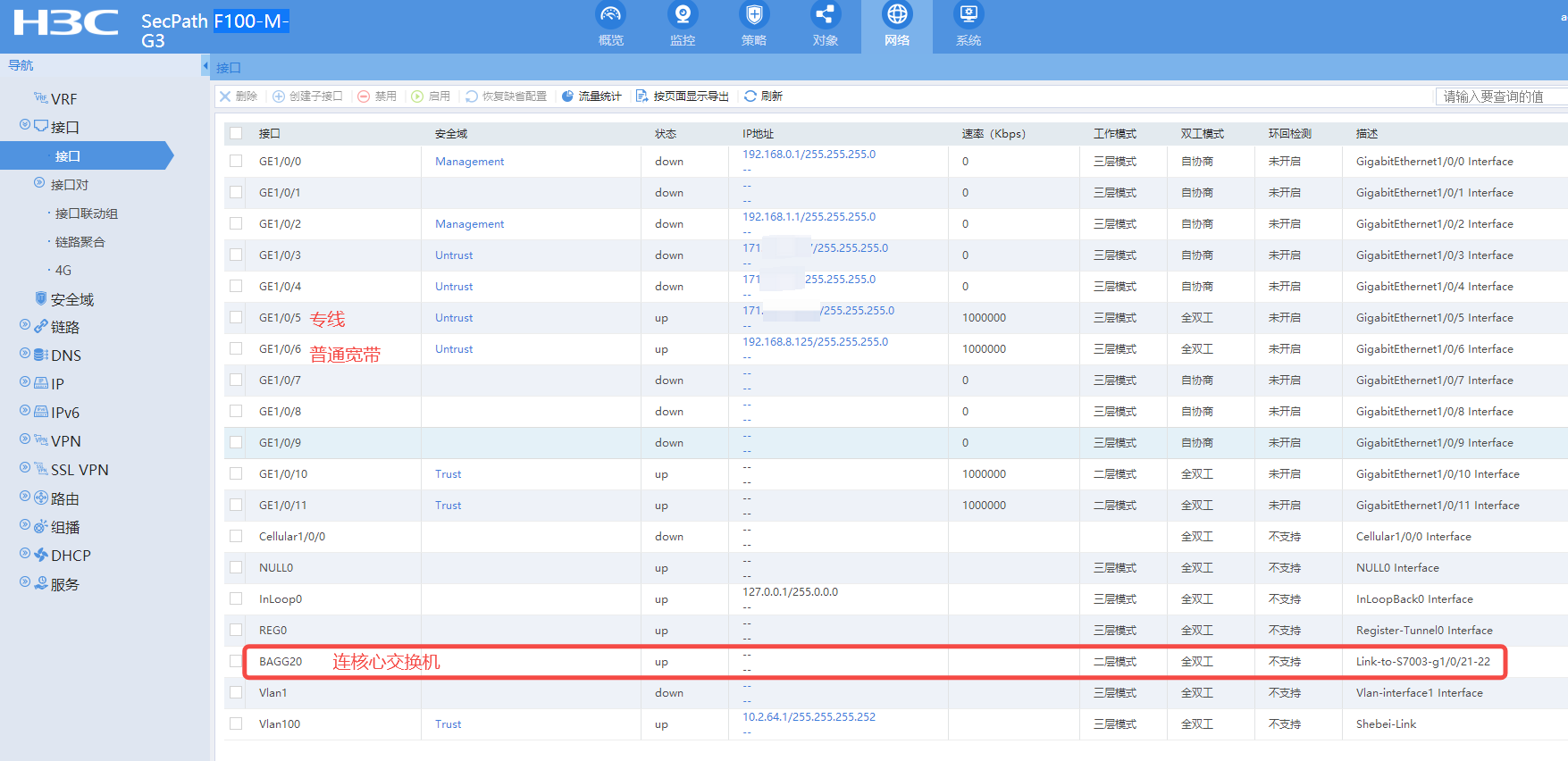 公司有台型号F100-M-G3的防火墙,一条专线接在防火墙g1/0/5口上,还有一个普通宽带接在g1/0/6上,现在想让访问特定网址时走普通宽带,该怎么配置呢?防火墙跟核心交换机连的接口做了聚合,我看了一些文档,尝试配置了策略路由,但都没生效,希望有大佬帮忙看下哪里配置错了
