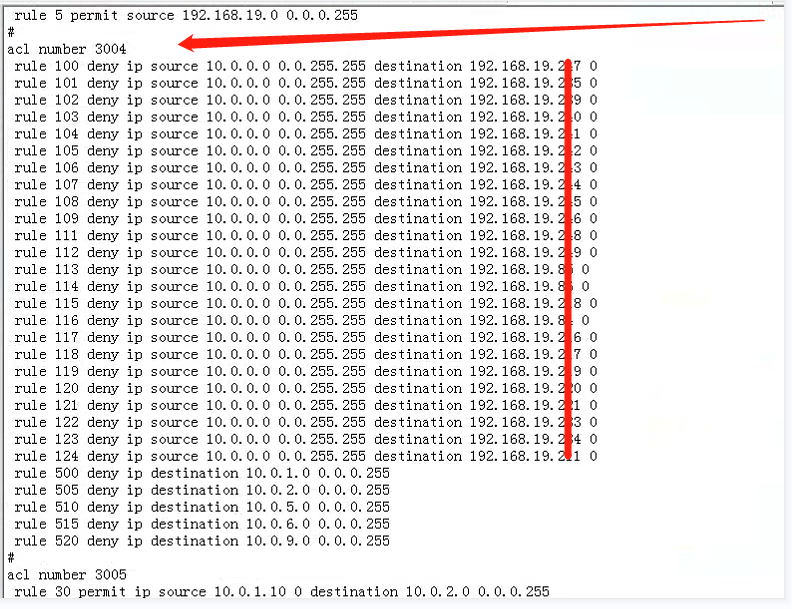 但是acl 3004,前几条rule 100-rule 520,都是deny,再加上末尾deny any,岂不是所有都deny了吗?但是其他的ip也还能访问。这怎么解释?