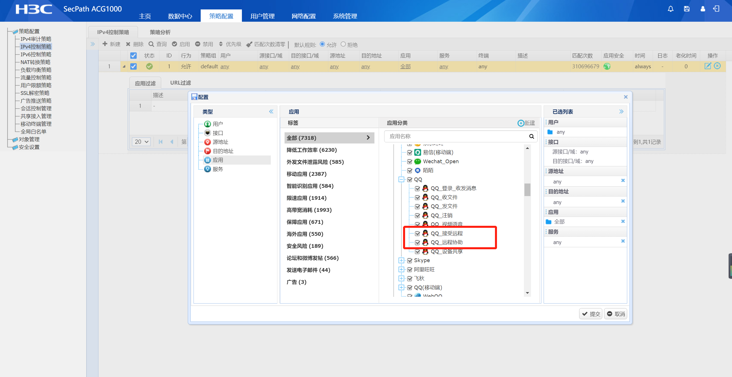 控制策略那里可以配置一条禁止策略,应用选择红框内的进行禁止