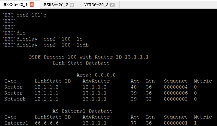 在路由器1上查ospf进程101的lsdb发现没有这条外部路由,这就导致在路由器3上面也学不到 66.6.6.6这条路由。
