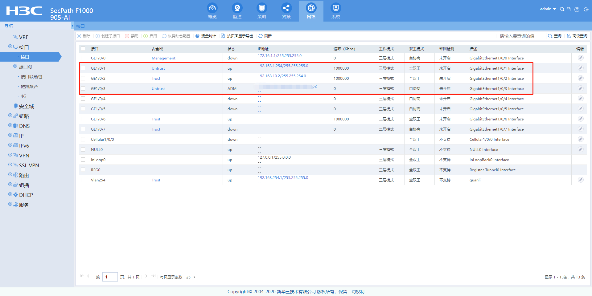 之前有两条宽带,已配置好,现在增加了一条专线,配置接口GE1/0/3,ip、dns配置都是对的,和接口GE1/0/1是同一个安全域,但无法通过接口GE1/0/3上网,把GE1/0/1网线拔了也不行,要怎么配置呢