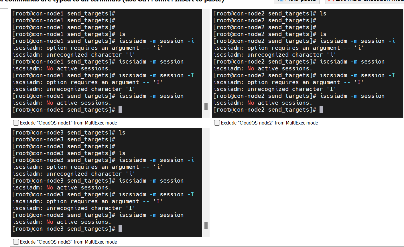 在安装过程中,使用iscsiadm -m session 命令尝试进行挂载,因为未配置存储IP地址,所以挂载失败