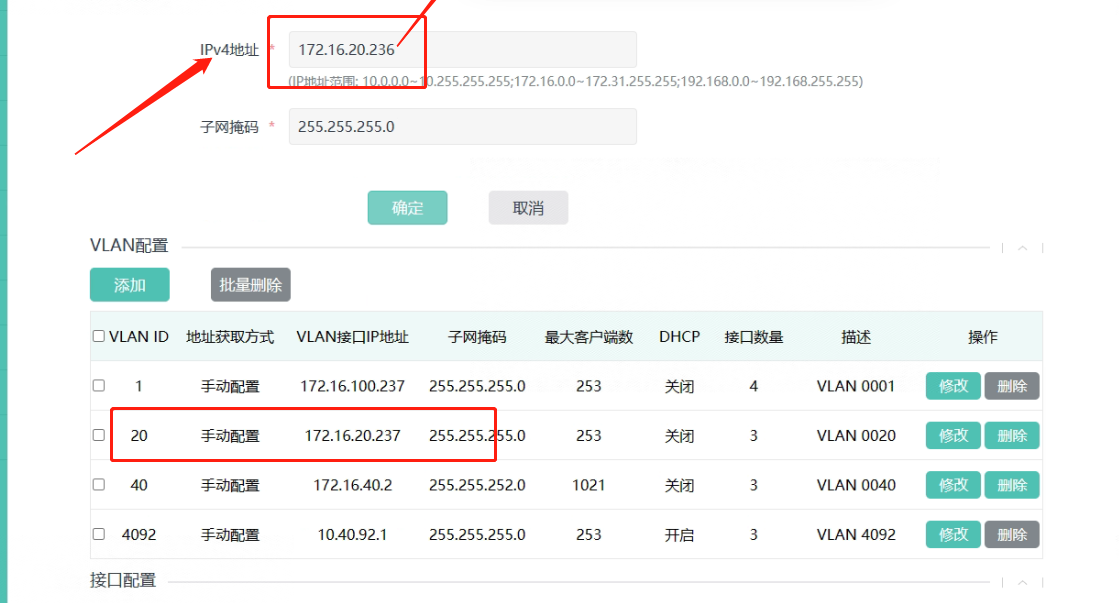 这里修改的是vlan4092的地址;但是vlan20已经配置这个段了,所以vlan4092不能再配置这个段的地址了,所以提示冲突