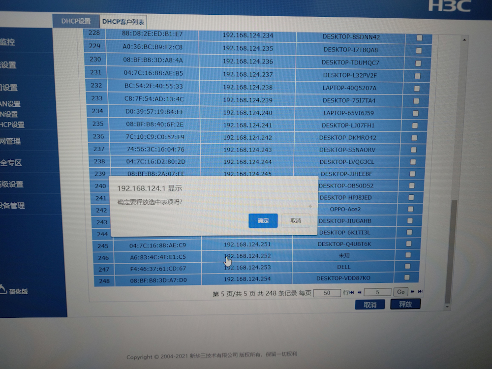 不知道买了这款路由器的用户,是否没有那么多登录设备,永远发现不了这个bug?H3C其它家用路由器断电之后,DHCP记录都会清空,唯独是BX54这款断电之后依然记录这些「不再登录的ip信息」,记录也算了,数量达到240+左右还没法分配ip,希望有熟悉工程人员可以反馈一下这个bug,不然每半个月手动释放一下ip是非常麻烦的事。