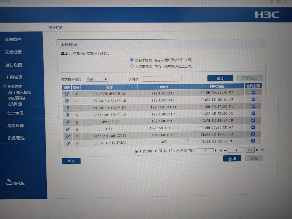 另外,「家长控制」页面,同样有记录ip信息,这个列表满254条记录,电脑同样无法获取ip上网。