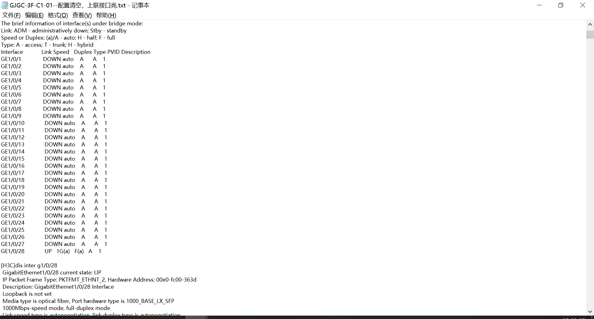 H3C S5110-28P-PWR配置会自动丢失,下联的AP接口灯都不亮,AP掉线,只有上联光口灯亮着,到达现场console查看设备配置全部丢失。交换机没有重启。下面是配置截图和当时现场抓取的诊断信息。
