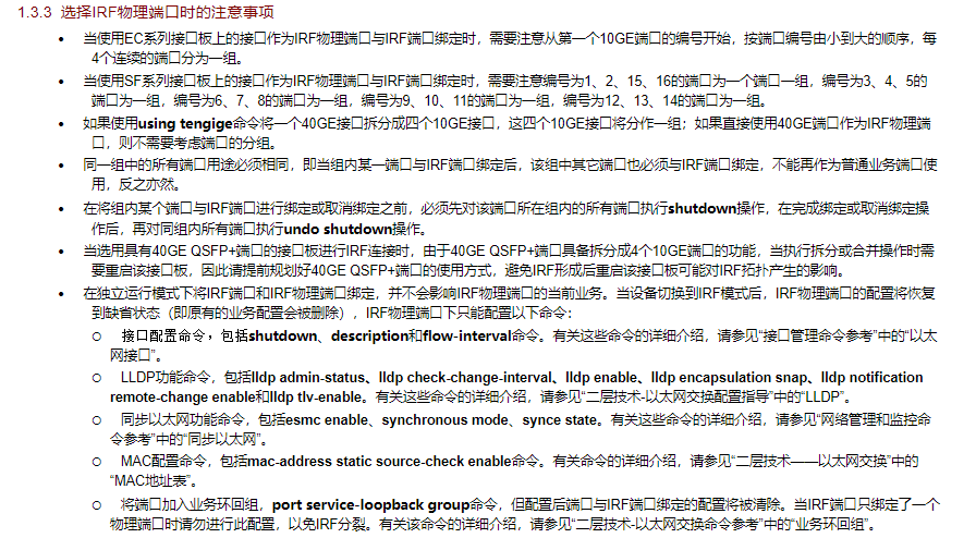 · 当使用EC系列接口板上的接口作为IRF物理端口与IRF端口绑定时,需要注意从第一个10GE端口的编号开始,按端口编号由小到大的顺序,每4个连续的端口分为一组。