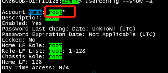 命令不对 CN6600B-01:FID128:admin> userconfig --change root -e yes rootaccess --set all Usage: userConfig --change <username> [-l <LF_ID list> -r <LF role>] [-h <LF_ID>] [-c <chassis role>] [-d <description>] [-x] [-u] [-e yes | no] [-at -access-time <HH:MM-HH:MM>]