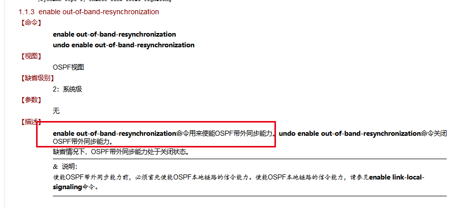 enable out-of-band-resynchronization命令用来使能OSPF带外同步能力。undo enable out-of-band-resynchronization命令关闭OSPF带外同步能力。