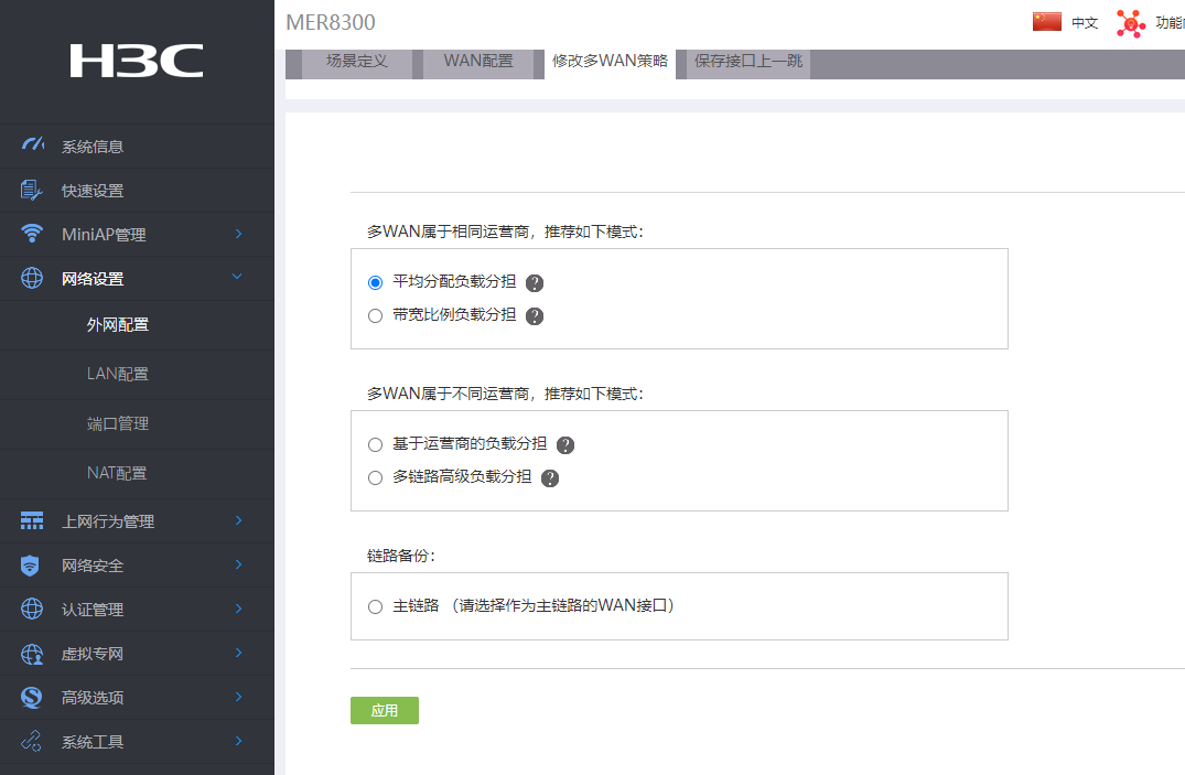 路由型号MER8300,现有移动(专线)、联通(普通)两条宽带,需求为服务器集群网络走移动出口,办公网络走联通?