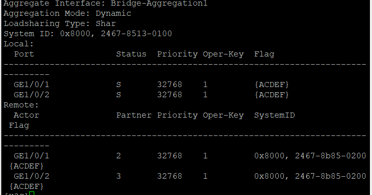 S1和S2的0/1和0/2加入聚合组BAGG1,聚合组配置如下:S1和S2聚合组配置一样。