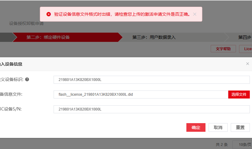 提示 验证设备信息文件格式时出错,请检查您上传的激活申请文件是否正确.