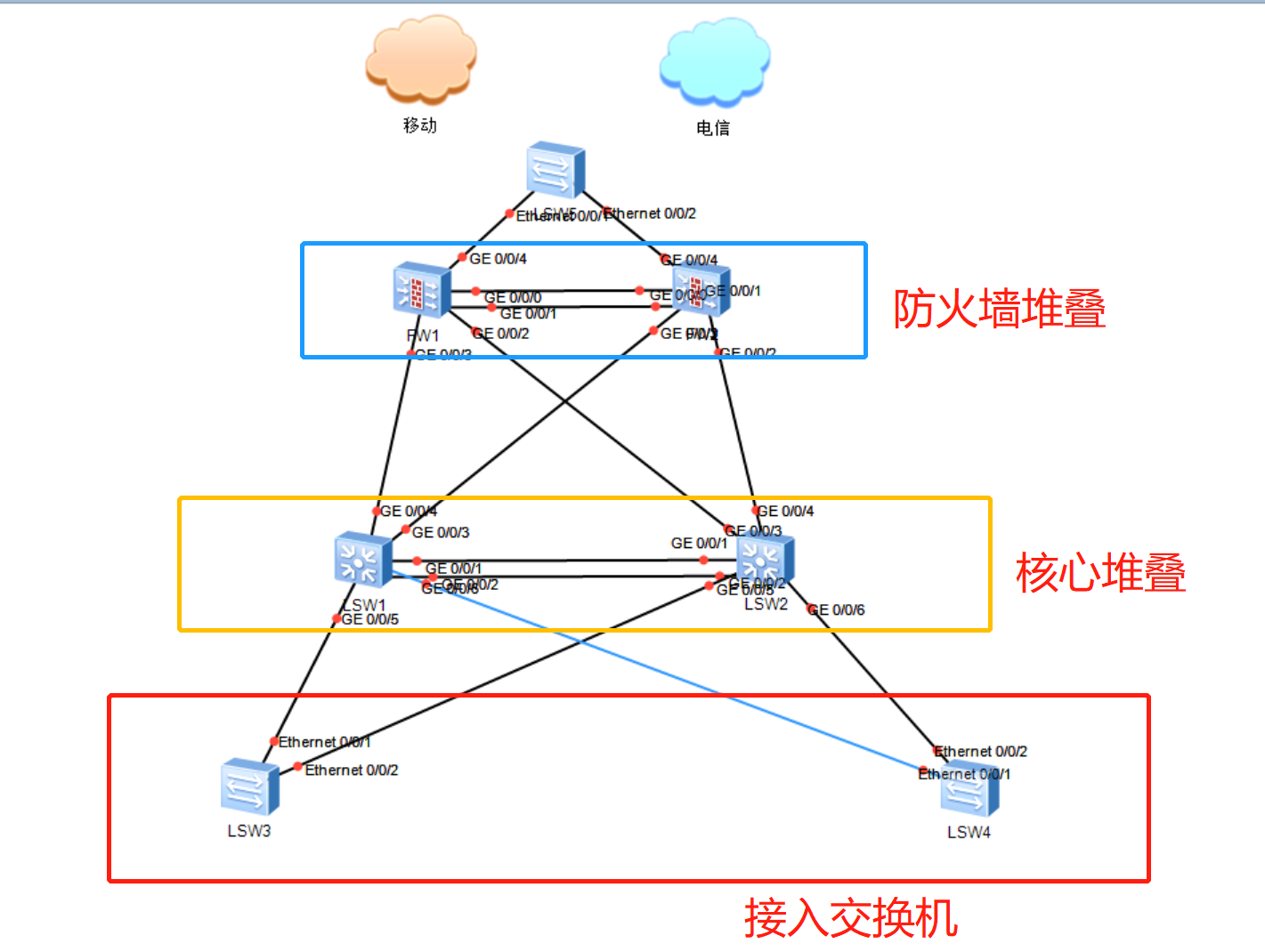 1、堆叠的情况,防火墙上端需要加个交换机