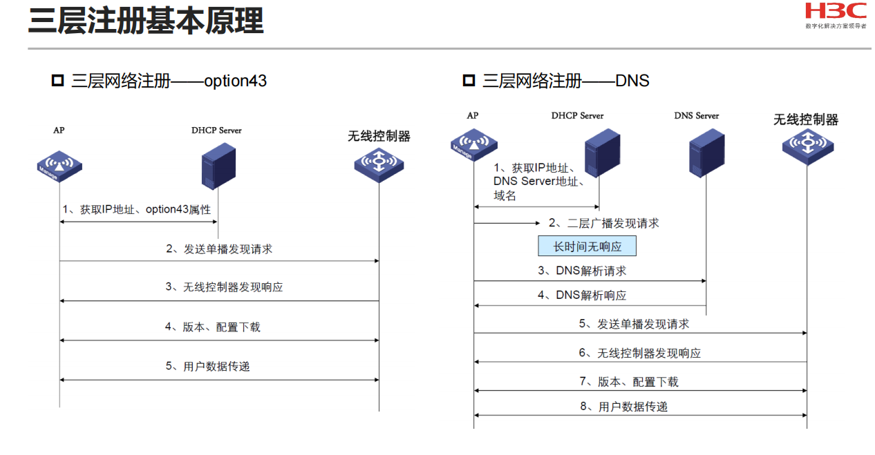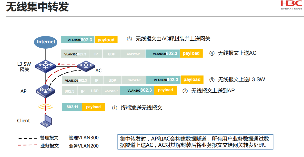 H3C AP和AC之间采用CAPWAP(Controlling and Provisioning of Wireless Access Point,无线接入点控制与供应)隧道进行通信,使用UDP协议作为传输协议,并支持IPv4和IPv6协议1。CAPWAP隧道为AP和AC之间的通信提供了通用的封装和传输机制,分为控制隧道和数据隧道,控制隧道用于对AP进行管理和监控,数据隧道用于转发客户端的数据报文1。
