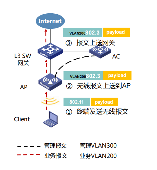 2、放行业务vlan应该是AP部署的是本地转发模式,此时无线客户端的流量由AP直接转发。如果是集中转发模式除非AP有线口有接终端在用,否则接入交换机接AP的接口不用放行业务vlan,因为集中转发场景无线客户端的流量会通过隧道直接透传到AC,由AC解封装后再转发。