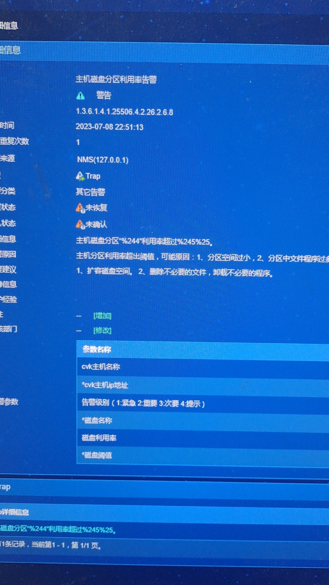 imc升级结束之后,平台的告警页面出现了如下两种告警,1、主机磁盘分区利用率2、主机日志分区在24小时内增加,并且描述像是乱码,这种情况可以通过设置阈值来解决么?但是没有找到阈值告警在哪里