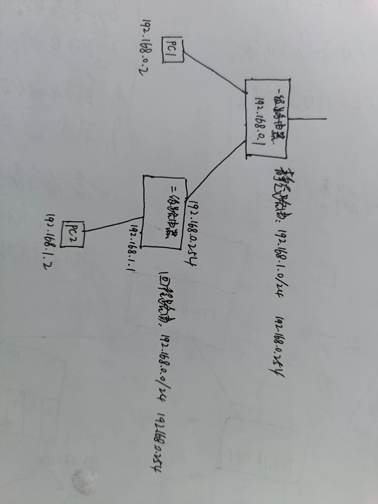 二级路由器:wan:192.168.0.254 ,lan:192.168.1.1 ,PC2: 192.168.1.2