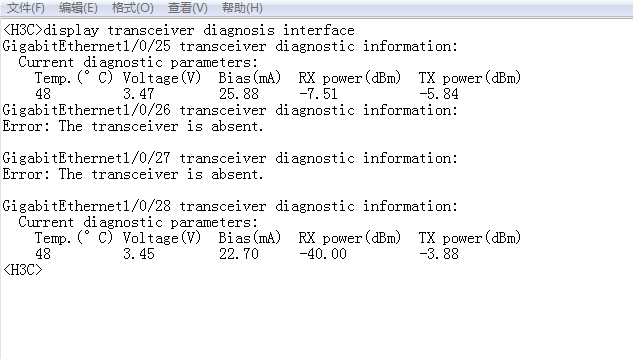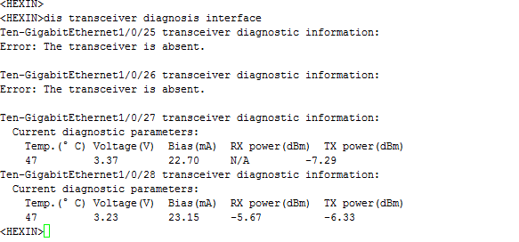 <H3C>display transceiver diagnosis interface GigabitEthernet1/0/25 transceiver diagnostic information: Current diagnostic parameters: Temp.(°C) Voltage(V) Bias(mA) RX power(dBm) TX power(dBm) 48 3.47 25.88 -7.51 -5.84