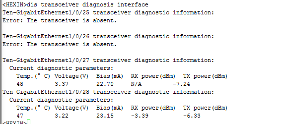 <H3C>display transceiver diagnosis interface GigabitEthernet1/0/25 transceiver diagnostic information: Current diagnostic parameters: Temp.(°C) Voltage(V) Bias(mA) RX power(dBm) TX power(dBm) 48 3.47 25.88 -7.51 -5.84 GigabitEthernet1/0/26 transceiver diagnostic information: Error: The transceiver is absent. GigabitEthernet1/0/27 transceiver diagnostic information: Error: The transceiver is absent. GigabitEthernet1/0/28 transceiver diagnostic information: Current diagnostic parameters: Temp.(°C) Voltage(V) Bias(mA) RX power(dBm) TX power(dBm) 48 3.45 22.70 -40.00 -3.88 <H3C>