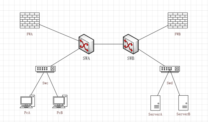 需求2:当隧道断开或FW硬件故障,PcA访问ServerA行驶路径SWA-SWB-ServerA;