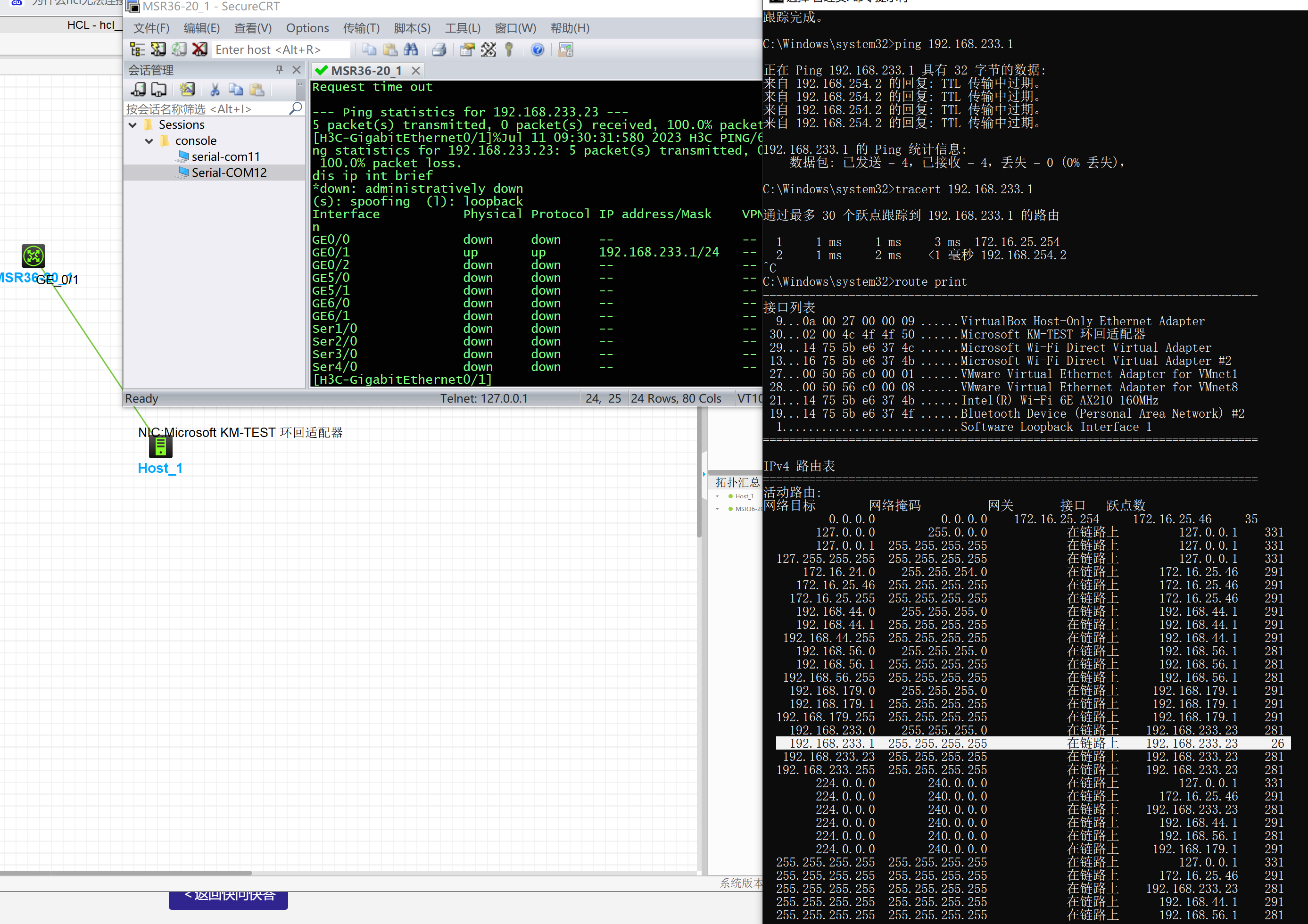 重启后也是一样,而且我在hcl里面去ping也没有在环回网卡上抓到hcl发出来的arp包,只抓到本机的 Sender MAC address: 02:00:4c:4f:4f:50 (02:00:4c:4f:4f:50) Sender IP address: 192.168.233.23 Target MAC address: 00:00:00_00:00:00 (00:00:00:00:00:00) Target IP address: 192.168.233.1