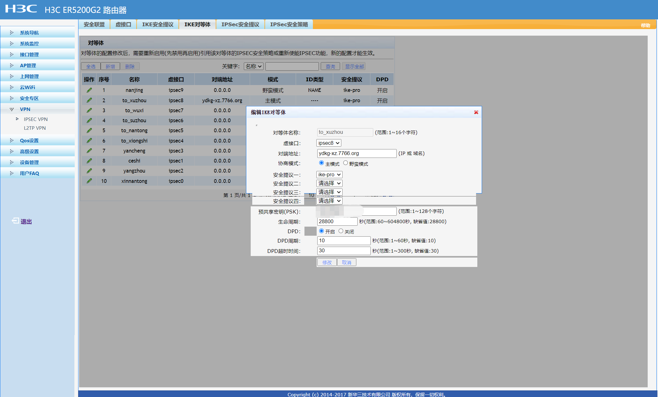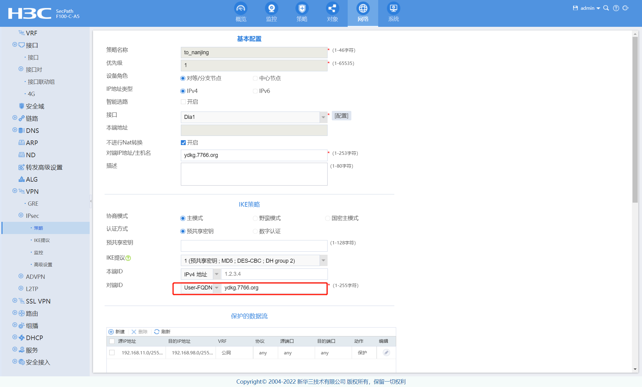 同样,拨号地址到期后,重新获取地址,也需要重新输入解析后的新IP地址建立IPSec,隧道起来后 换成域名又正常访问