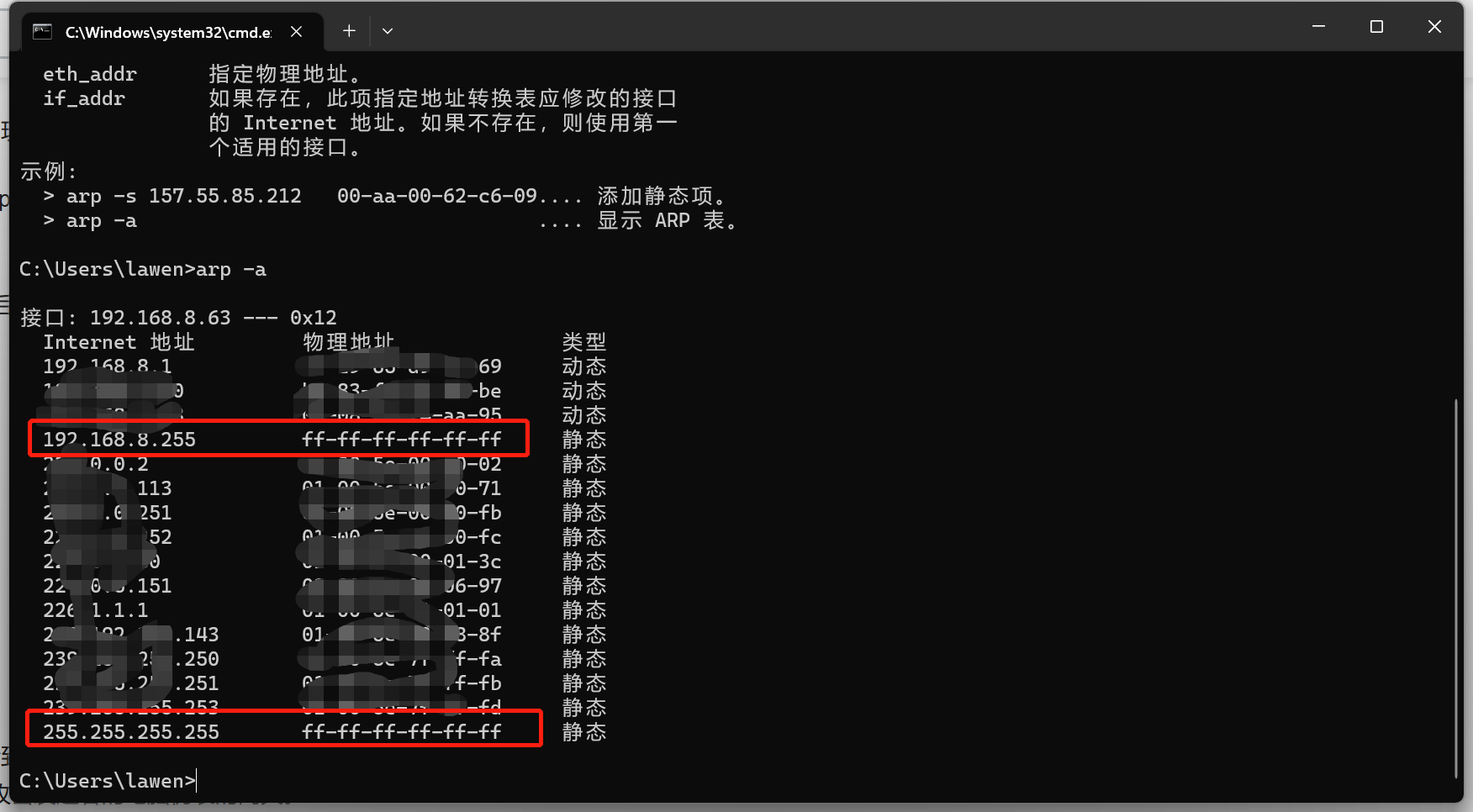 arp -a 命令如图,出现两个.255的广播地址正常吗