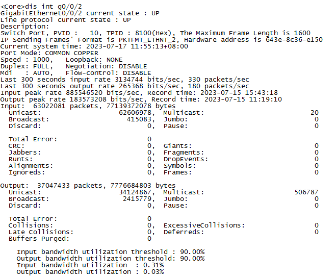 Jul 17 2023 11:04:45+08:00 Core %%01IFPDT/4/IF_STATE(l)[33]:Interface GigabitEthernet0/0/2 has turned into UP state.
