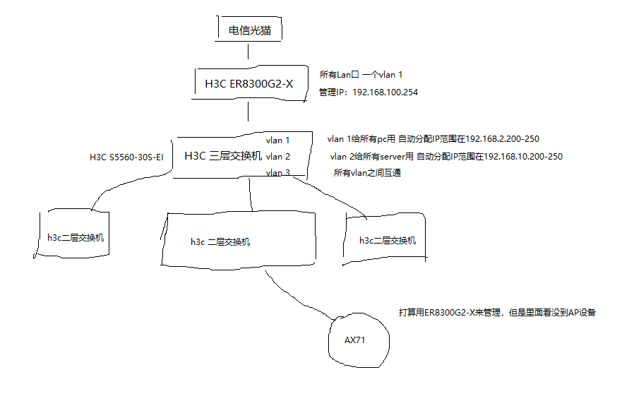 这个网络结构现在每天一直在用,Mini AX71是刚买的,AP接到二层交换机上,笔记本连上AP后能上网,有自动获得三层交换机上设置的DHCP网段的IP。由器内的AP上线配置应该没有问题,AP和路由器也是支持的,不走三层交换机路由器上是可以发现AP设备的, 只是不知道这个路由器是否支持AP三层注册,或者要配置三层换机的DHCP option 43才能发现设备?