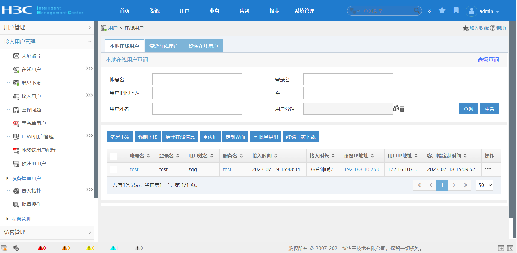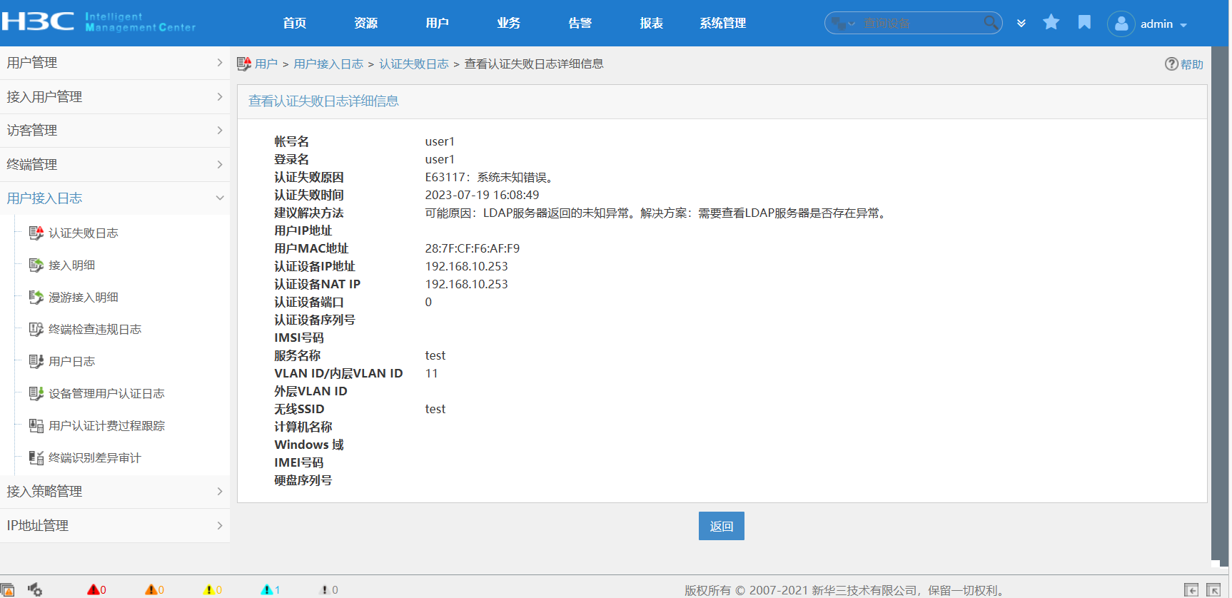使用IMC本地账户可以正常认证上线,使用LDAP同步的账户提示系统未知错误,LDAP同步检测都是正常的