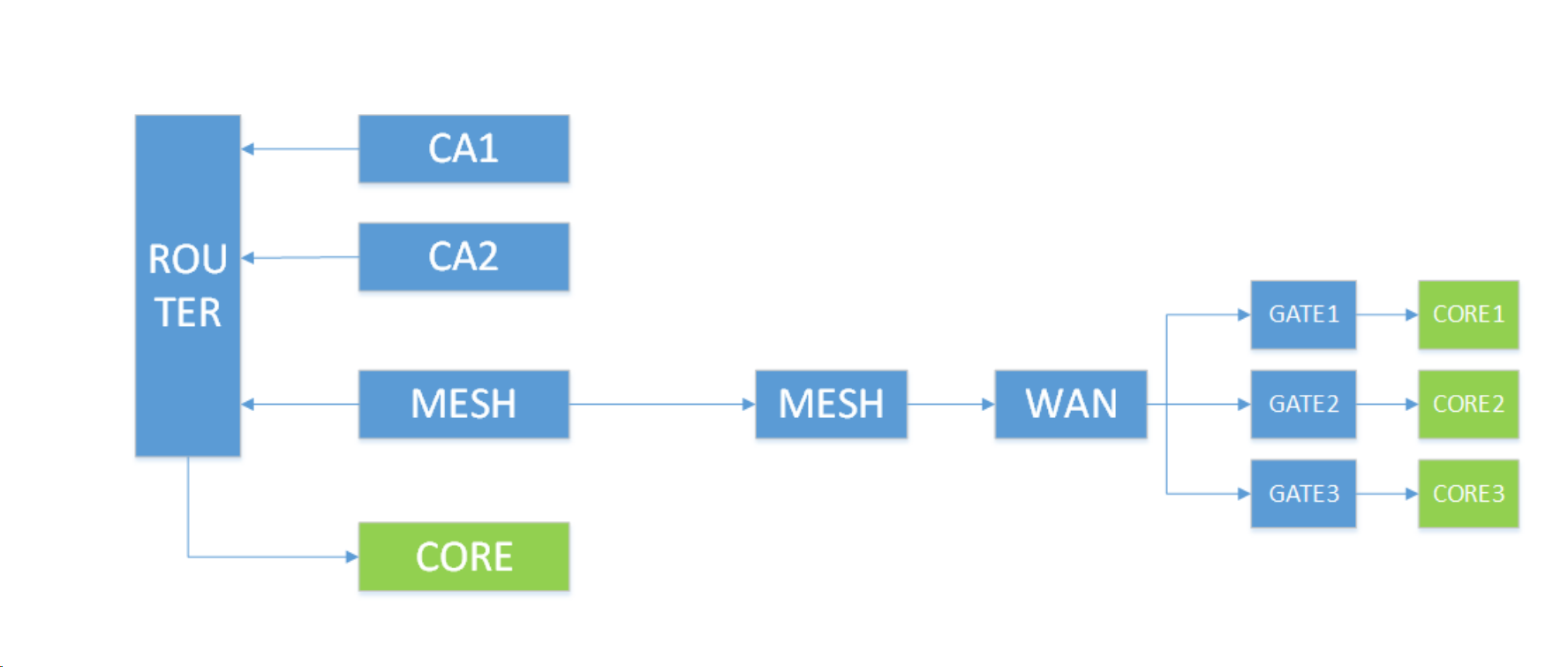 请教各位大佬,下图中CA1、CA2和CORE与路由器连接,路由器想通过VPN与公网的CORE1、CORE2、CORE3连接,其中,CA1能同时与CORE、CORE1、CORE2连通;CA2能同时与CORE和CORE3连通,这个方案能实现吗?