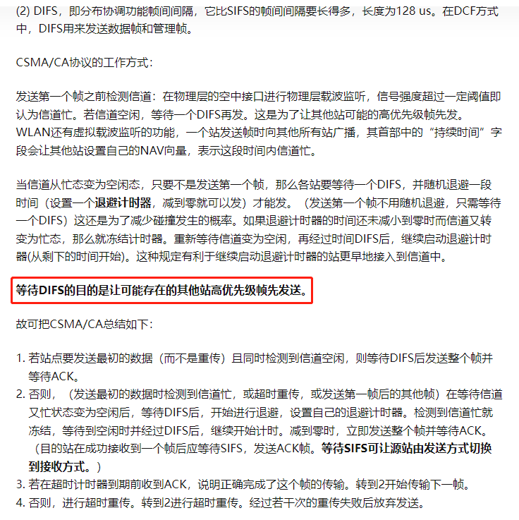 在学习WLAN的过程中,在理解CSMA/CA机制的时候,发现不同的终端设备在侦听完信道中设备发送数据帧结束后,会统一进入DIFS阶段,之后再统一继续进入 倒数阶段,请问为什么要有这个DIFS阶段,不直接进入 倒数阶段呢 ?请各位前辈不吝赐教 !