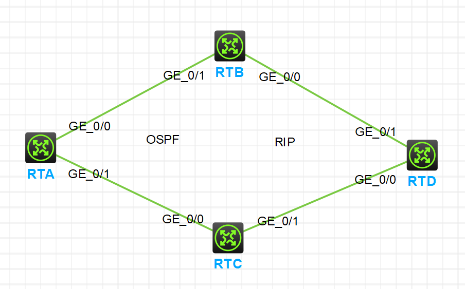 RTA、RTB、RTC、RTD四台路由器组成环形结构;RTA、RTB、RTC运行OSPF路由协议;RTB、RTC、RTD运行RIP路由协议。
