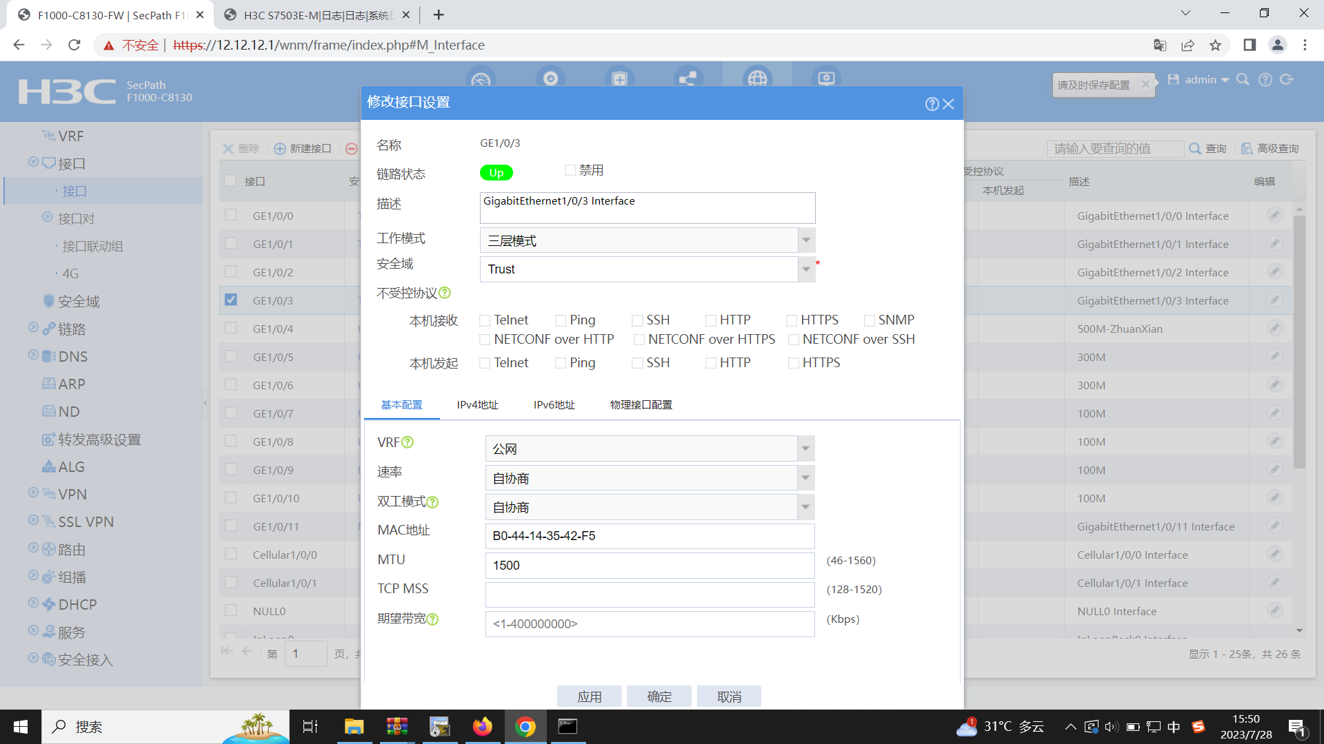 好像是新版本的才支持接口下的http ssh telnet ping 等功能,这个功能我测试好像不太好用,现在访问防火墙还是走的安全策略。不像是华为的,接口管理优先级高于安全策略的