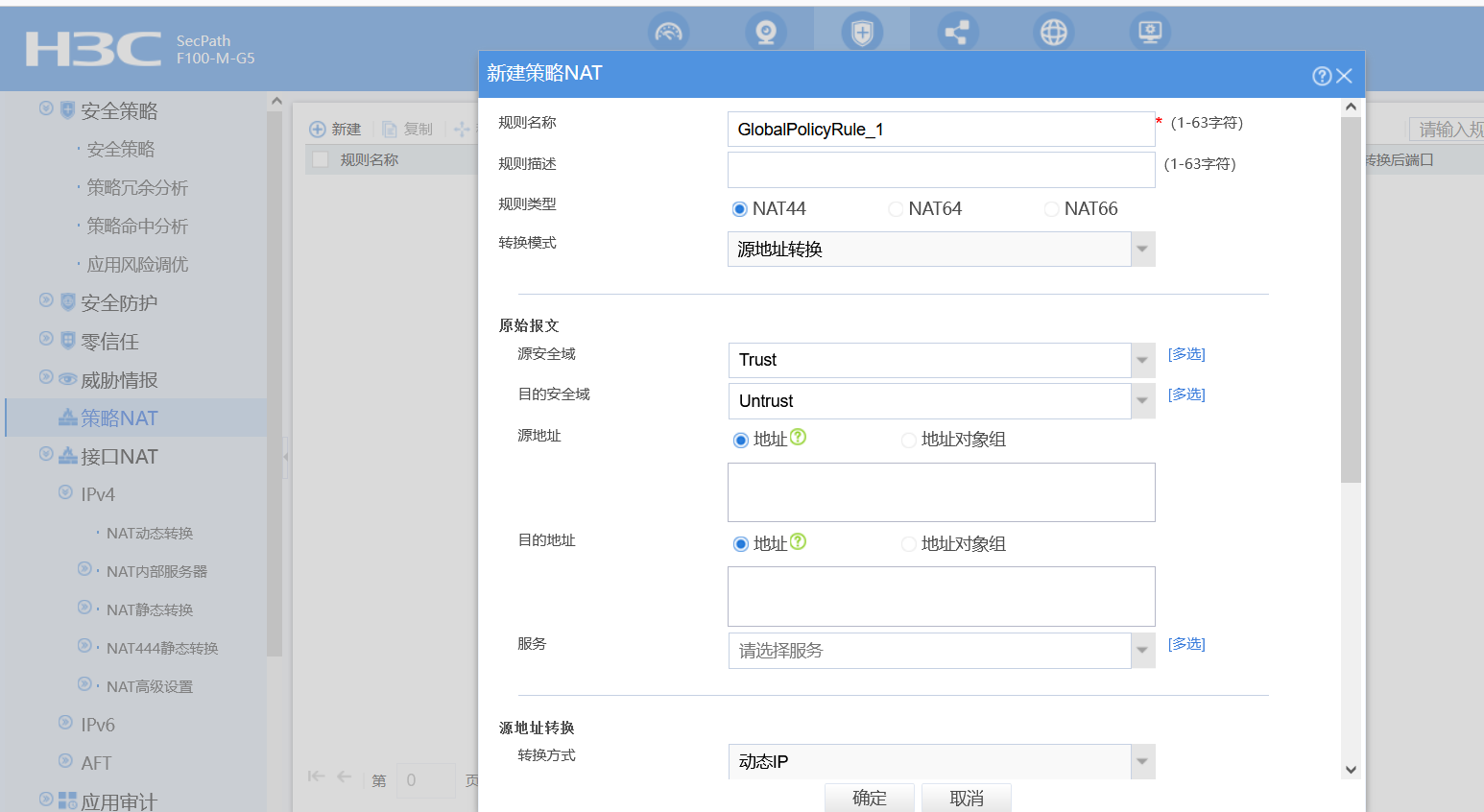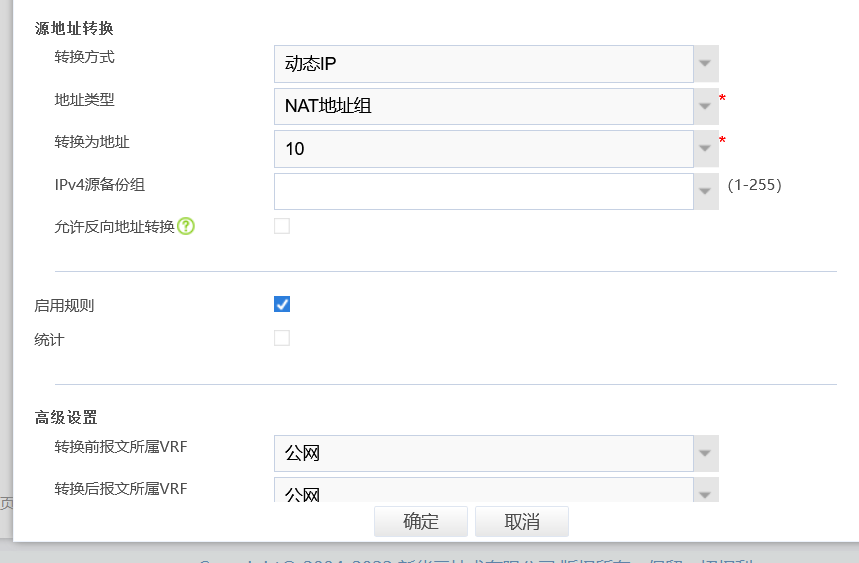 web 页面中配置:在策略NAT中新建策略-按照如下界面配置,区域,源地址根据实际组网选择,转换方式为动态IP,地址类型选择地址组,转换地址根据你实际情况创建并调用
