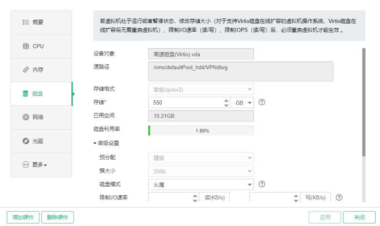 E0750P09版本UIS超融合系统,业主在机械硬盘的存储池上创建一台虚机,运行时虚机上系统提示磁盘速率不满足要求。现场使用3副本形式缓存加速,加速盘设置满足指导手册要求。请问平台虚机磁盘读写速率会受什么影响吗?该问题平台上是否有办法进行调优?